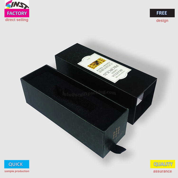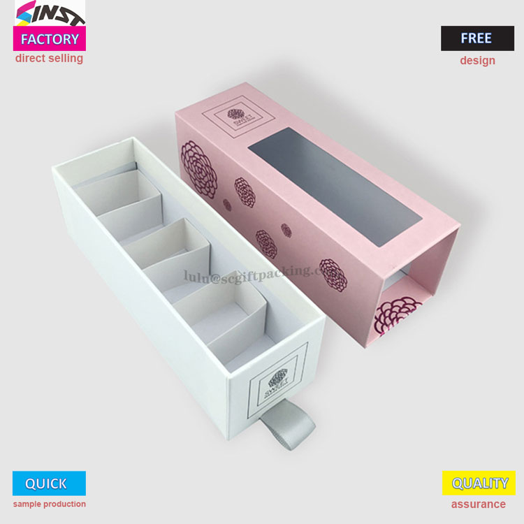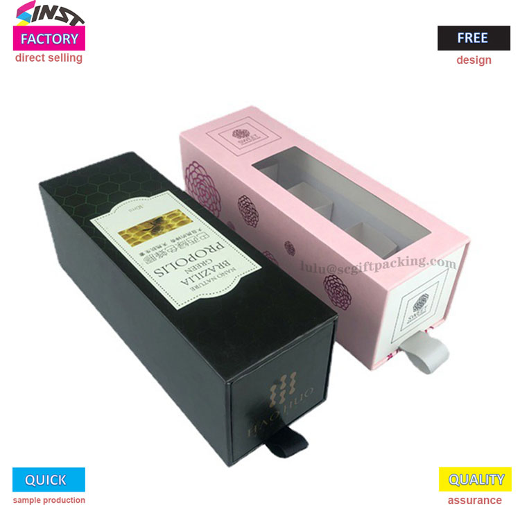 आवश्यक तेल के लिए यह लक्जरी कठोर दराज स्लाइडिंग गिफ्ट बॉक्स पैकेजिंग एक कंपार्टमेंटलाइज्ड डिज़ाइन और पारदर्शी खिड़कियां हैं जो ढक्कन को खोलने की आवश्यकता के बिना बॉक्स के अंदर चार डिब्बों की स्पष्ट दृश्यता की अनुमति देते हैं; जब काले और गुलाबी डबल बक्से को एक साथ रखा जाता है, तो डिजाइन की सरलता देखी जा सकती है: ब्लैक बॉक्स में अधिक बनावट वाले लुक के लिए शरीर पर अलंकृत सोने के अक्षर होते हैं, और साइड पर ब्लैक पुल रिंग को आसानी से खुला खींचा जा सकता है; गुलाबी मॉडल एक पारदर्शी खिड़की को बरकरार रखता है, जो सीधे सार नमूने के लिए विशेष टैंक देख सकता है - लोशन परीक्षण, 10ml सार कसकर लपेटा। सार के नमूनों से लेकर उपकरणों तक, विभाजन स्पष्ट और अनम नहीं है।