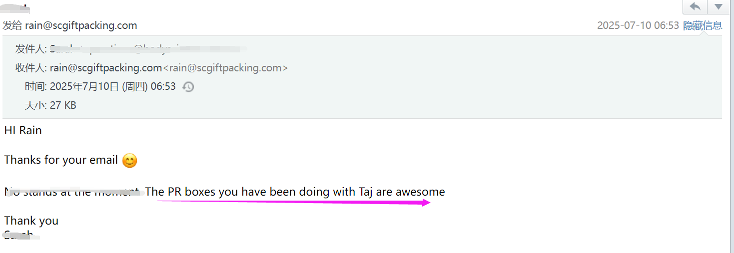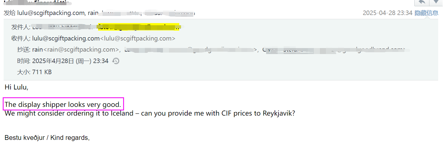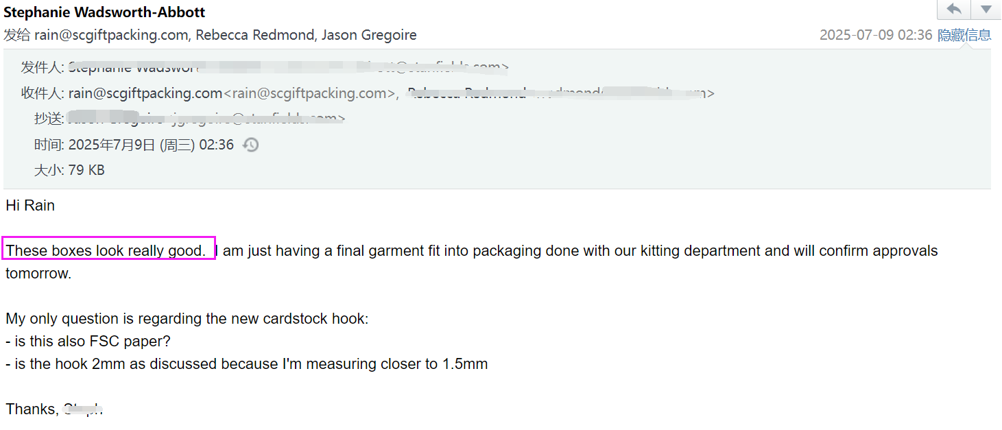 अंत में एक पैकेजिंग कारखाना मिला जो डिजाइन को समझता है! "- एक अमेरिकी उपहार ब्रांड के प्रमुख एमिली से संदेश