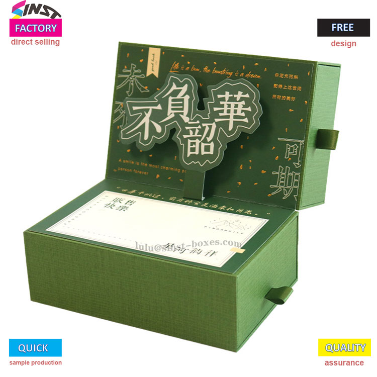 यह परफ्यूम उपहार बॉक्स, जो सीधे SINST पैकेजिंग और प्रिंटिंग द्वारा बेचा जाता है, मुख्य स्वर के रूप में ताज़ा हरा रंग लेता है। दराज प्रकार का बॉक्स बॉडी त्रि-आयामी कलात्मक पात्रों और सोने की सजावट से सुसज्जित है। परफ्यूम उपहार बॉक्स के किनारे को "शाओ" और "क्यूई" से सजाया गया है, और आंतरिक कुशन नाली स्थिर और सुगंधित है, जो नाजुकता दिखाती है। भावनाओं को व्यक्त करने के लिए कलात्मक भावना और अनुष्ठान भावना का सह-अस्तित्व गुणवत्ता विकल्प है।
