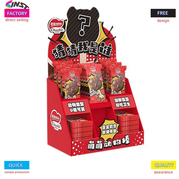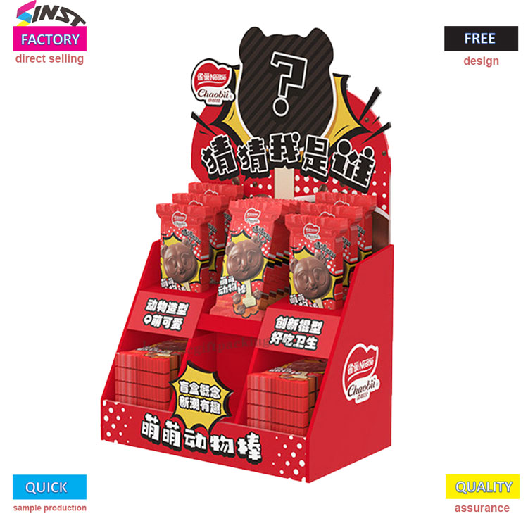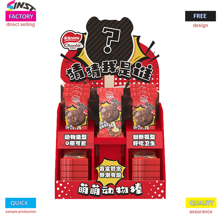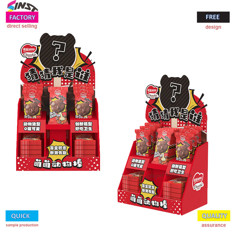 यह पालतू स्नैक कार्डबोर्ड PDQ डिस्प्ले बॉक्स अपने मुख्य रंग के रूप में उच्च संतृप्ति लाल है और दृश्य प्रभाव के साथ आता है, जिससे यह टर्मिनल डिस्प्ले के लिए एक आंख को पकड़ने वाला उपकरण बनाता है। बॉक्स के शीर्ष पर मजेदार नारा "लगता है कि मैं कौन हूं" उपभोक्ताओं की जिज्ञासा को उत्तेजित करता है; इंटीरियर एक बहु-परत स्तरित संरचना को गोद लेता है, बड़े करीने से पशु आकार की स्नैक पैकेजिंग (लॉलीपॉप के रूप में) प्रदर्शित करता है।